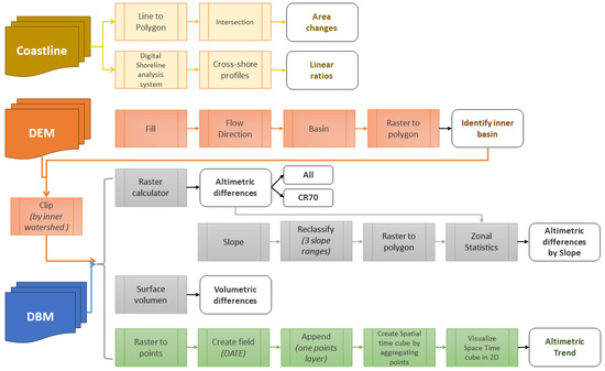 The DEM and DBM datasets in the ESRI GRID format were the input data in this section of our work. The temporal change methodology was carried out with GIS tools in the ArcGIS Pro environment [64]. Both datasets underwent the same procedures for change evaluation, except that the determination of the inner watershed was executed only for the DEM dataset. The GIS methodology is shown in Figure 4 and consists of four subprocesses: (i) calculation of altimetric differences with a study case in CR70, (ii) calculation of altimetric differences by range slope, (iii) calculation of volumetric differences, and (iv) a space time pattern study. In a previous step, the delimitation of the DEM study was defined using the determination of the inner watershed limit. Altimetric differences were used to identify areas of gain and loss in the temporal range. Slope classification was intended to assess the influence of positional error on these differences. Volumetric difference calculations allowed for the isolation of positional errors from elevations, elucidating the overall trend within the inner basin. This trend was spatially delineated via the statistical analysis of temporal studies. These studies helped us to understand the surface dynamics and their potential influence on, as well as material contribution to, the bay.