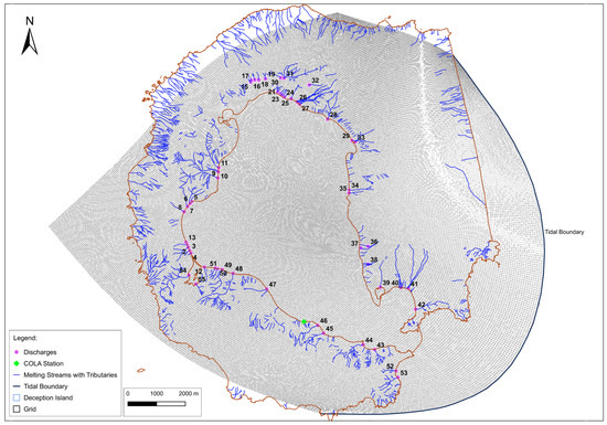 The model domain was defined as a computational curvilinear grid (Figure 5), with a total of 731 × 731 cells and a maximum resolution of 15 × 10 m2 within Deception Island. The initial conditions of the simulation were the values obtained with field measurements during surveys carried out in 2012 (for more details, see [38]), avoiding cold starts; the inner bay bathymetry in the model that from the SIMAC DBM (Table 3); and the closest coastline, temporally speaking, the 2003 coastline (Table 1). The year 2003 was sufficiently distant from the 1970 eruption to reflect the ongoing trends in the bay. Meanwhile, the outer open-sea bathymetry, representing the areas beyond the coastline, was covered by the External South Shetlands DBM (Table 3).