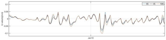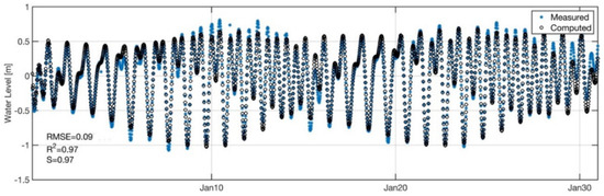 The model was calibrated for the water level variable and for the harmonic components of the velocity (M2 and K1), both amplitude and phase. The water level data were obtained from the field survey conducted in 2012 (COLA Station in Figure 5), and the data for the harmonic velocity components were compared with the results of previous studies [39,68]. The full month of January 2012 was selected as the calibration date because it was a month where there was no lack of data and there were average meteorological conditions. The results are shown in Figure 6, where it can be observed that the agreement is excellent for the water level, obtaining values of R2 0.98 and skill coefficient 0.97.