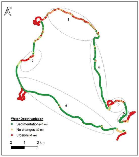 During the first period (1970–2003), reflecting the impact of new volcanological material, there was a water area increase of 0.77 km2 primarily due to erosion and the inclusion of Kroner Lake (Figure 8, zone 3), while decreasing by 0.23 km2 due to sedimentation along the shoreline. In the next period (2003–2020), considered the prevailing trend, the interior water area of the bay expanded by 0.48 km2, encompassing the opening of “Lago Escondido” (zone 1) and glacier retreat (zone 4). Also, it decreased by 0.05 km2 due to sediment movement. The annual ratios for bay area increase were near-consistent, at 0.023 km2/year and 0.028 km2/year in the two periods, while land area decreased from 0.007 km2/year in the first period to 0.002 km2/year in the second.
