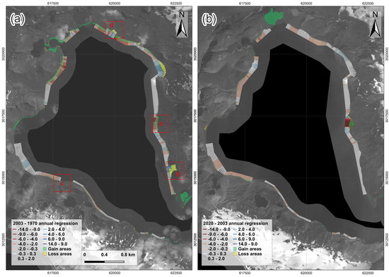 Overlapping annual shoreline regression of gain–loss areas in two different time periods: (a) 1970–2003 with new QB as the background and some enlarged in areas in Figure 10 (red rectangles with letters a, b, c, and d); and (b) 2003–2020 with K3 as the background [23]. Both figures are in EPSG: 32720 and have the same scale and north orientation.