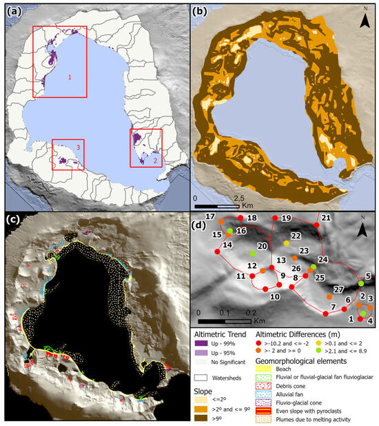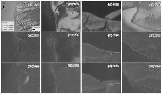 Figure 10 presents some zoomed-in images of the most notable gains/losses observed when we performed a visual analysis of the coastlines following the denomination in Figure 9a. These show the main changes that occurred in the western part of the island, specifically at the Black Glacier due to retreat (Figure 10a1–a3, zone a in Figure 9a), and its southern region (Figure 10b1–b3, zone b in Figure 9a). Additionally, they show the erosion of the slope in front of the Spanish base (Figure 10c1–c3, zone c in Figure 9a) and part of the erosion in the northern area of Port Foster (Figure 10d1–d3, zone d in Figure 9a). Zone d presents great sedimentation action produced by water and ash slides during the last eruption period in the observed inlet, too.