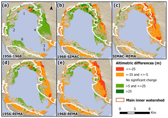 Following the GIS methodology of Figure 4, after the determination of the new inner watershed from REMA, temporal altimetric variations were calculated and are depicted in Figure 11, spanning the six decades from 1956. The upper panels illustrate the evolution over successive time intervals, whereas the lower ones delineate these temporal segments from the two newly studied older DEMs (1956 DEM and 1968 DEM) to the most recent one (REMA). Note the prevalence of green areas in Figure 11a,b, particularly around the sites of the most recent volcanic eruptions (Figure 11a, zones 1 and 2), which is contrasted by the loss of red in zone 2, signifying floods of molten water released from the glacier due to the opening of subglacial vents and the partial melting of the ice cover [15,36]. In particular, the areas covered by ice (inside the white line) exhibit the most significant and dynamic differences. These aspects are particularly pronounced in Figure 11c,e. Snowy areas are complicated surfaces to position altimetrically in the photogrammetric process, as can be read in a note written on the printed GCE map [44]. To the lack of control points is added the thawing periods making possible the high figures found.