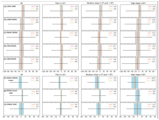 We used some discrete altimetric levels, of −150, −100, 0, 100, 200, 300, and 400 m, for the evaluation of volumetric differences. These datasets did not have a specific capture date. For SIMAC DEM, 1986 was used as the collected date, corresponding with the DEM information for most of the surface. REMA was assigned 2015 as the middle year, and for the same reason, 2014 was assigned for IHM DBM (see Table 2 and Table 3). In addition to this, the DEMs retained their original spatial resolution (2 or 2.7 m), while in the case of DBM, two new resampled raster files with a new resolution were used (IHM DBM 50 m and SIMAC DBM 50 m). Annual ratios per unit of 3D area were computed to obtained comparable values.