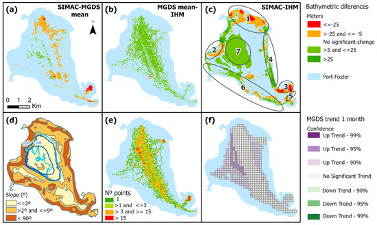 The inner bay of Deception Island is a collapse caldera with a flat bottom and steep walls, and thus its bathymetry is an important aspect of research on the island. In fact, this bay can almost be considered a lake, with important reception of tephra after eruptive processes [52,53]. In addition to this, the presence of submerged volcanoes such as the Stanley Patch volcano, the largest volcanic cone located in the southern sector of the bay [54], and the narrow entrance to Port Foster (Neptune’s Bellows, see Figure 1b) require precise bathymetry for navigation purposes.