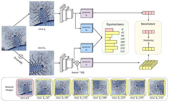 - Equivariant learning branch. Equivariant learning refers to predicting the rotation intensity label y for the input image x after applying the rotation transformation , that is, predicting the rotation intensity labels of views and . During training, this task is optimized by minimizing the cross-entropy loss of predicting rotation transformation labels.