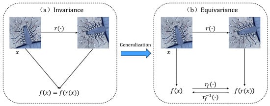 For input image x, applying the transformation r to the image x is the same as the equivalent transformation of features, meaning that equivariance encourages the transformations applied to features to have the same intensity as those applied to the input image, as shown in Figure 2b. By extending invariance to Equation (4), the encoder f learns the equivariance of transformation R. In other words, equivariance is the generalization of invariance.
