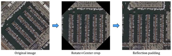 To explore how the number of rotation transformations affected the ability of our method to learn good representations, we defined three tasks with different numbers of rotations. The three tasks used images with 4, 8, and 12 rotations, where the rotations were all spaced at 45° intervals. To avoid black border areas appearing after the rotations and thus causing the leakage of GT angle information, we used a center crop after rotation to obtain images of the same size as the original and then used reflection padding to fill the black areas [], as shown in Figure 6. Based on the results of the experiments on the three datasets in Table 8, we found that we achieved the highest accuracy after applying eight rotation transformations. This proves that for the oriented object detection task, choosing eight rotation transformations during pretraining is the optimal rotation transformation scheme.We analyzed this as a result of a more detailed angle division of oriented objects in remote sensing. Compared to other downstream tasks, oriented object detection is more difficult in the task of recognizing the rotation intensity. Therefore, more rotation transformations need to be applied during pretraining to learn better representations of rotation equivariance.