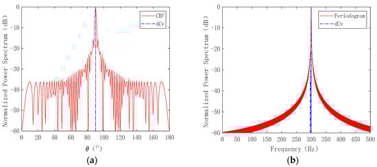 To mitigate the signal energy leakage in the azimuth, conventional beamforming is combined with the R–L deconvolution algorithm to estimate the target’s azimuth of direction [27,28,29,30]. In this method, the beam pattern is treated as a point scattering function (PSF) in deconvolution, and the target azimuth is determined using the R–L iterative algorithm. This estimation technique, when compared to conventional beam forming (CBF), achieves a narrower main lobe and reduced side lobes. These features are instrumental in suppressing azimuth energy leaks for the target. However, its applicability is limited to arrays whose beam patterns exhibit shift-invariant properties. The deconvolution algorithm is further extended from the azimuth domain to the frequency domain. This extension effectively eliminates the spectrum leakage caused by the window function. It is achieved by deconvolving the power spectrum of the finite-length signal with the power spectrum of the window function, resulting in enhanced frequency resolution [31,32].