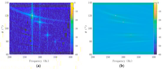 As can be seen from Figure 9, the performance of the 2D-MUSIC algorithm was seriously degraded, the background noise level was significantly improved, and the dynamic range of data was reduced. Compared with other algorithms in the same data dynamic range, the target could not be directly observed. The 2D-MVDR algorithm could keep the target from the azimuth, but there were significant deviations in the signal frequency estimation. The proposed algorithm accurately estimated the target information both in the azimuth and frequency, reduced the side lobe, and restrained the energy leakage in the azimuth and frequency. As seen in Figure 9c, due to the energy leakage of the strong line spectrum, several weak line spectrums are masked by the side lobe of the strong line spectrum. After processing using the algorithm in this paper, the strong and weak line spectrum was distinguished. As seen in Figure 9d, the spectrum obtained using Fourier theory could not distinguish several line spectrums due to the limitation in the processing time length. After deconvolution, some line spectrum information could be clearly distinguished due to the enhancement of the frequency resolution. After calculation, the deconvolution gain obtained by the sound source was 15.50 dB.