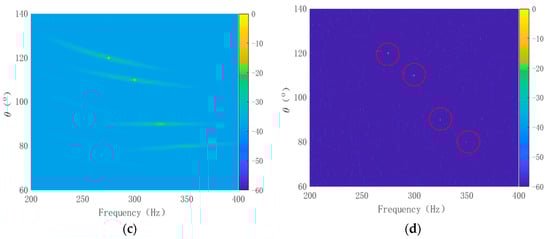 For evaluating the processing performance of deconvolution FRAZ spectrum estimation, the original FRAZ spectrum estimation was compared with reference algorithms such as 2D-MVDR [4] and 2D-MUSIC [8]. A more complex scenario was considered, involving four point source single-frequency signals in the far field. These signals had incidence angles of 120°, 110°, 90°, and 80° and radiation frequencies of 275 Hz, 300 Hz, 325 Hz, and 350 Hz, respectively. Their signal-to-noise ratios were 15 dB, 5 dB, −5 dB, and −15 dB. The noise was modeled as Gaussian white noise. The basic parameters for frequency–azimuth signal processing remained consistent with those described in Section 3.1.1. Considering the computational cost and estimation effectiveness of the 2D-MVDR and 2D-MUSIC algorithms, the tapped delay line was set to 8. The original FRAZ spectrum is displayed in Figure 3a, the frequency–azimuth spectrum based on 2D-MVDR is illustrated in Figure 3b, the frequency–azimuth spectrum based on 2D-MUSIC is depicted in Figure 3c, and the results of the deconvolution FRAZ spectrum estimation are shown in Figure 3d.