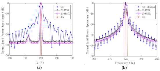 Figure 3 demonstrates that both the 2D-MVDR and 2D-MUSIC methods were effective in reducing energy leakage for the target’s azimuth, compared to the original FRAZ spectrum, although some leakage persisted in the frequency dimension. Notably, the deconvolution-based FRAZ spectrum estimation method proposed in this study proved to be superior in suppressing two-dimensional double-side lobe leakage. A one-dimensional slice of the target located at 120° was selected for detailed examination. Figure 4a presents the azimuth spectrum comparison effect at the target’s frequency point, and Figure 4b shows the spectrum comparison effect at the target’s azimuth.