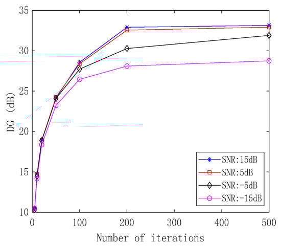 As illustrated in Figure 5, the deconvolution gain improved with an increase in the number of iterations. This enhancement is attributed to the gradual narrowing of the main lobe as the iterations progress, which in turn increases the accuracy of the FRAZ spectrum estimation. However, beyond a certain point, the deconvolution gain tended to stabilize because the iterative algorithm approached convergence. Prior to this convergence, the variation in deconvolution gain across different input SNRs was not substantial.