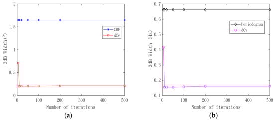 To further elucidate, the half-power beamwidth (i.e., −3 dB width) of the signal spectral peak at a signal-to-noise ratio of 15 dB was calculated. Figure 6a displays the curve of the signal spectral peak −3 dB width in the azimuth dimension as a function of the number of iterations, while Figure 6b presents the curve of the spectral peak −3 dB width in the frequency dimension relative to the number of iterations.