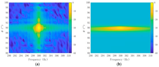 In this way, represents the point scattering function, and refers to the sound source distribution function. According to the linear array design and frequency decomposition design, is known when the semaphore is given. Here, the search variable is designable. In general, the search variable is not necessarily a semaphore. In a two-dimensional joint search, due to the coupling of and , ; that is, is a shift function of and , and Formula (11) cannot be expressed as a convolution operation. When or , Formula (9) is related to only one semaphore, which is either or . Then, this degenerates into mere beamforming or mere frequency analysis, and Formula (11) is the convolution form, which is a natural property of one-dimensional linear systems. Now, the azimuth and frequency are decoupled by variable transformation, and the variables and are defined: