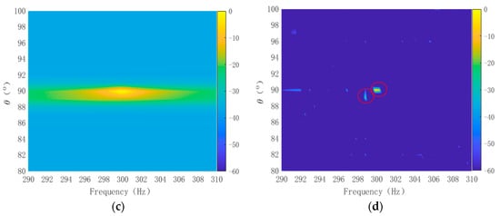 Consider a sinusoidal signal in the far field with a radiation frequency of 300 Hz, an amplitude of 1, and an incidence azimuth of 90°. The duration for signal processing was set at 1.024 s, with a sampling frequency of 1 kHz. Utilizing Equation (8), the relevant azimuth and frequency range were scanned to acquire the FRAZ power spectrum, as depicted in Figure 1a. Additionally, a three-dimensional representation of this spectrum is shown in Figure 1b. These are the original FRAZ spectra obtained directly using frequency–domain beamforming. After undergoing two-dimensional deconvolution processing, the estimated FRAZ spectrum is illustrated in Figure 1c, with its corresponding three-dimensional visualization presented in Figure 1d. These are referred to as the deconvolution FRAZ spectra.