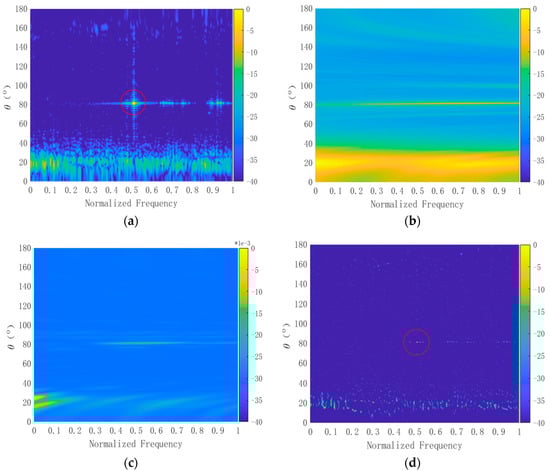 FRAZ results of sea trial data: (a) original FRAZ spectrum; (b) the 2D-MVDR processing results; (c) the 2D-MUSIC processing results; (d) FRAZ spectrum effects after deconvolution.