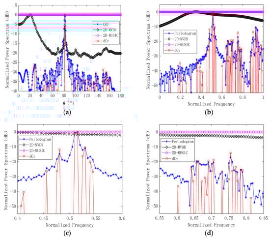 FRAZ results of adjacent strong and weak targets: (a) original FRAZ spectrum; (b) the 2D-MVDR processing result; (c) the 2D-MUSIC processing result; (d) deconvolution FRAZ spectrum result.