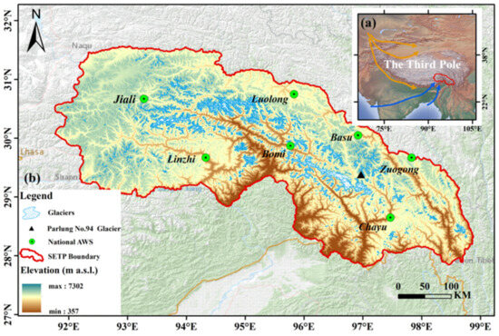 Map of the SETP region: (a) shows the SETP location in the Third Pole region, which is mainly influenced by the westerly winds (yellow curve and arrow) and the Indian summer monsoon (blue curve and arrow); (b) displays the distribution of glaciers and national weather stations, also including the location of Parlung No. 94 glacier.