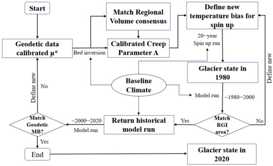 Before reconstructing the historical glacier mass balance, we performed a dynamical spin-up using historical climate data. This allowed the glacier to grow to its size at the RGI date. Additionally, a dynamical initialization helped to remove strong assumptions in the OGGM default settings. These assumptions included the idea that glaciers are in dynamical equilibrium at the glacier outline date (which is required for the ice thickness inversion) and that the mass balance melt factor parameter (“melt_f”) is calibrated based on geodetic mass balance, without taking into account the dynamically changing glacier geometry. The main dynamical spin-up methods are introduced as follows (Figure 2).