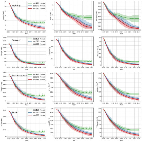 Glacier dynamics (length, area, volume) prediction results from 2020–2100 within the three major basins located in SETP (Mekong Basin, Salween Basin, Brahmaputra Basin) and the whole SETP, the shaded part represents one standard deviation.