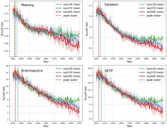 In the Mekong Basin, our estimations suggest that under the SSP126 scenario, the peak water point for glacier runoff will occur in 2023. Under the SSP370 scenario, it will happen in 2025, and under the SSP585 scenario, it is expected to occur in 2022. Moving to the Salween Basin, our predictions indicate that under the SSP126 scenario, the peak water point for glacier runoff will occur in 2023. Under the SSP370 scenario, it is projected to occur in 2025, while under the SSP585 scenario, it is estimated to happen in 2023. Interestingly, the SSP126 and SSP585 scenarios shared the same peak water year in the Salween Basin. In the Brahmaputra Basin, our projections suggest that under the SSP126 scenario, the peak water point for glacier runoff will arrive in 2026. Under the SSP370 scenario, it is also expected in 2026, while under the SSP585 scenario, it is anticipated to occur in 2023. Similarly, in the Brahmaputra Basin, the peak water years were the same for the SSP126 and SSP370 scenarios. Considering the entire SETP region, we estimated that the peak water point for glacier runoff will occur in 2026 under the SSP126 and SSP370 scenarios. However, under the SSP585 scenario, the peak water point was predicted to occur earlier, specifically in 2023.