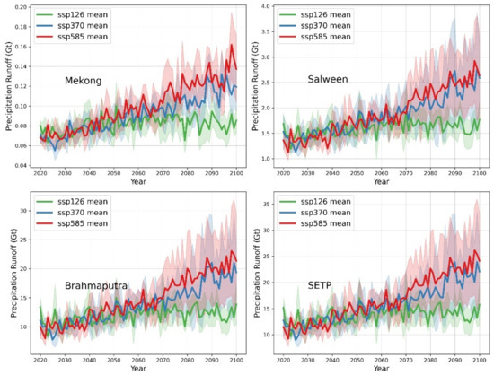 The precipitation runoff prediction of three basins and SETP from 2020 to 2100 based on the ensemble average of multiple GCMs and considering different SSPs; the shaded part represents one standard deviation.