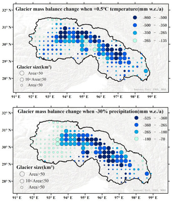 For further analysis, we discuss two scenarios where we set a 0.5 °C increase in temperature and a 30% decrease in the total precipitation and we investigated the spatial change in glaciers in the SETP (Figure 12). When we set a 0.5 °C increase in temperature, the glaciers in the upper SETP had severe mass loss, the lower SETP had relatively less mass loss, and the glaciers in the water vapor channel had the least mass loss. The lower SETP is closer to the Indian Ocean, and the summer monsoon brings a lot of precipitation to the lower SETP, especially the water vapor channel. When we set a 30% decrease in the total precipitation, the central and lower SETP were more sensitive to precipitation. As the lower part of the SETP serves as a central water vapor channel and features the lowest-altitude valley terrain, glaciers in this region primarily accumulate mass from the abundant precipitation brought by the Indian summer monsoon. Consequently, these glaciers exhibit greater stability in the face of precipitation changes compared to other regions within the SETP.