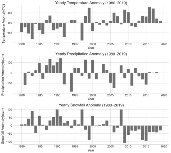 The figure above shows temperature anomalies, precipitation anomalies, and snowfall anomalies in the SETP region from 1980 to 2019.
