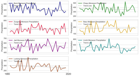 We analyzed the national weather station data distributed in the SETP from 1980–2019, the temperature of seven stations showed a consistent increase trend, while the precipitation showed a slight decrease in total. To further investigate the precipitation mechanisms, we chose the monsoon season (typically defined as June to September) as the yearly monsoon precipitation (Figure 15); we found four stations, namely, Bomi, Chayu, Linzhi, and Luolong, that showed a declining trend, while the other three stations, namely, Zuogong, Jiali, and Basu, showed a slightly increasing trend. The first four stations are closer to the Indian monsoon vapor channel, and thus, these decreases might have a relationship with the weaker magnitude of the Indian summer monsoon; the latter three stations might also be under the impact of a weaker summer monsoon, and their locations are relatively far away from the water vapor channel. In general, the overall declining trend in precipitation may have a relationship with weakened intensity of the Indian summer monsoon, this implies less cumulative precipitation during the monsoon season, leading the glaciers in the SETP to have lower incoming mass, and thus melting at a faster rate.