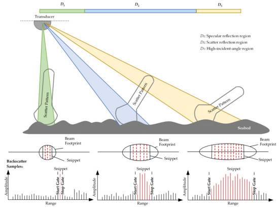 According to the operating principle of multibeam echosounders, one ping can acquire over hundred and even more echoes at multiple incidence angles. By contrast, affected by the scatter pattern of the seabed, the amplitude variations of echoes at different incidence angles are quite different when the sound reaches the bottom (Figure 1). Moreover, according to the variation characteristics of backscatter strengths, regions at different incidence angles are usually divided into three regions, namely, the specular reflection, scatter reflection, and high-incidence angle regions [22].