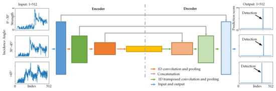 The model used in this study is based on the 1D-UNet model presented in our previous work; this model has been proven effective in bottom detection for side-scan sonars [14]. 1D-UNet, a one-dimensional version of the classical U-Net model [23], is suitable for target detection of sequences such as backscatter strengths of each beam. The 1D-UNet model contains two parts, namely, an encoder and a decoder. The encoder extracts features from multibeam backscatter strength sequences, whereas the decoder predicts sea bottom positions (Figure 4).