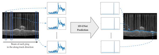 After the parameters of the models were tuned by training and validation, the trained models were used for bottom detection of multibeam water column data at specific incidence angles. The multibeam water column images are usually displayed in the along-track and across-track directions. Thus, we employed bottom detection procedures in both directions by using the 1D-UNet models (Figure 5 and Figure 6).