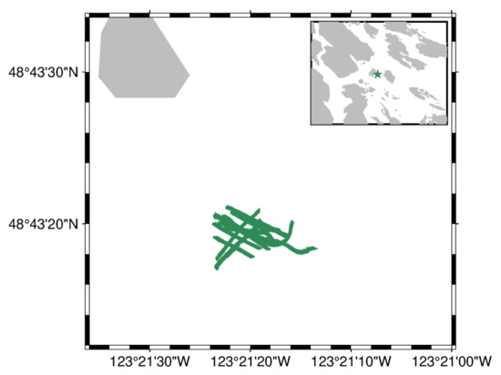 To verify the effectiveness of our proposed method, we selected multibeam water column data measured in Swartz Bay, Canada for the experiments. The surveyed water area and the coordinates of the track lines are shown in Figure 7. The multibeam data were measured by a Kongsberg EM3002 (operational frequency of 300 kHz) from 31 March to 2 April 2006 [24]. The average water depth in the survey area was approximately 20 m. This surveyed water area has an existing shipwreck. The body and mast of this wreck presented strong interference in the water column and led to incorrect bottom detection results. As the main focus of this research was about the bottom detection method, calibrations of the multibeam transducer and other sensors were not introduced.