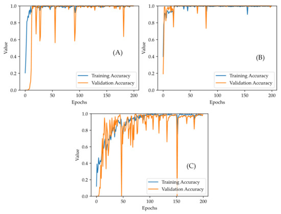 Training and validation accuracies at three different incidence regions: (A) specular reflection, (B) scatter reflection, and (C) high-incidence angle.