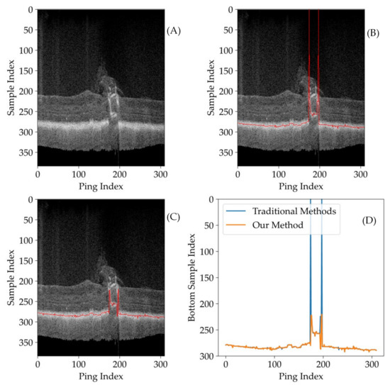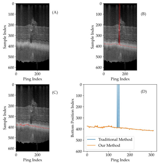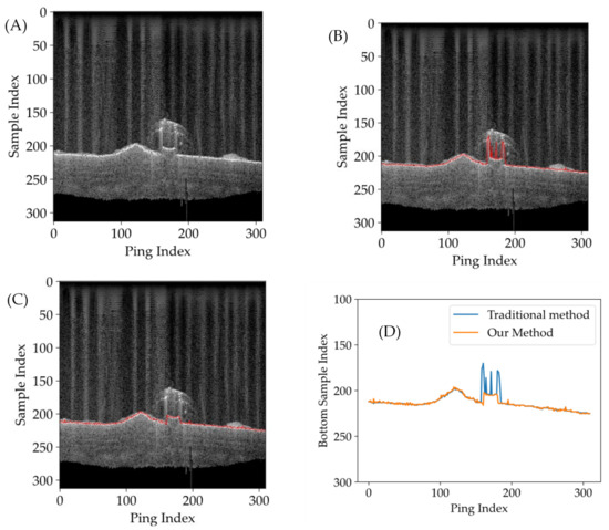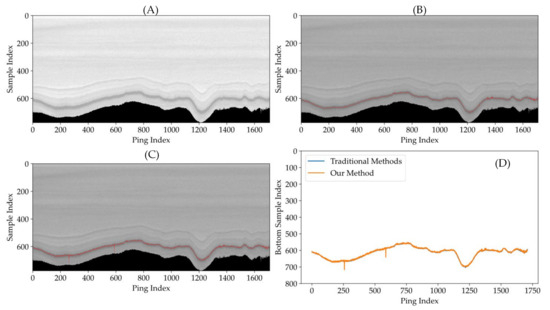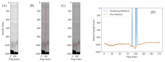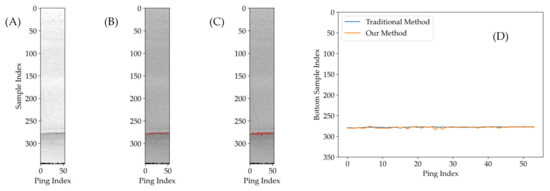 For comparison, the detection results of our deep learning method are shown in Figure 9C. Our method could effectively distinguish the differences between a real seabed and interference in the water column, avoid failure detection of the sea bottom, and obtain a continuous seabed. A comparison of the detection results between the traditional method and our proposed method is shown in Figure 9D.