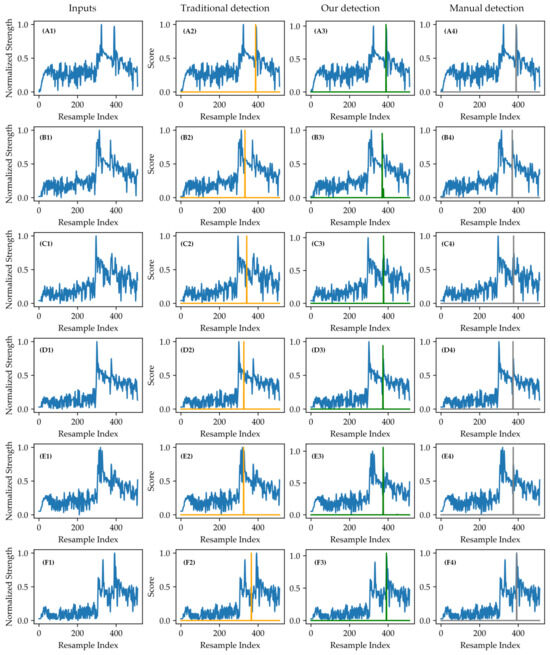 Comparison of bottom detections at an incidence angle of 0° between the traditional method, our method, and the manual method: (A1–F1) normalized backscatter strengths taken as the inputs; (A2–F2) bottom detections (orange lines) obtained using traditional methods; (A3–F3) our detection results (green lines); and (A4–F4) manual detection results (gray lines). Normalized strength means that the values of the backscatter strengths were normalized in the range of 0–1 for model training and prediction.