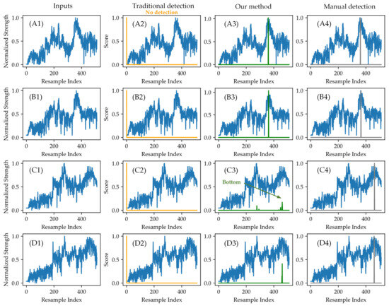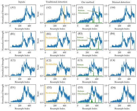 The beams with failure detections obtained using the traditional methods are shown in Figure 14. As further illustrated in Figure 14A2–D2, bottom detection results cannot be obtained by traditional methods; neither WMT nor BDI can calculate the results properly. By contrast, the bottom detection results can still be obtained by our method, as shown in Figure 14A3–D3. The positions of the maximum prediction scores in Figure 14A3–D3 were consistent with the manually detected bottom position (Figure 14A4–D4). These results prove the effectiveness of our proposed model at an incidence angle of 60°.