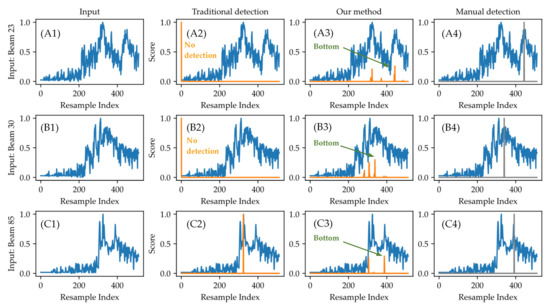Comparison of bottom detections at three different incidence angles by using the traditional method, our method, and the manual method: (A1–C1) input sequences; (A2–C2) traditional detection results (orange lines); (A3–C3) our detection results (orange lines); and (A4–C4) manual detection results (gray lines).