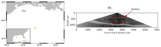 Selected survey lines obtained from the EX1402L3_EM302 dataset: (A) coordinates of the selected track lines and (B) bubble targets in the water column. The orange star and lines show the coordinates of these track lines.