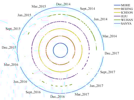 Latitude and longitude information from the six stations. From top to bottom in turn: Mohe, Beijing, Icheon, Jeju, Wuhan, and Sanya.