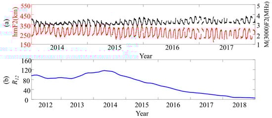 (a) Measured data of hmF2 and M(3000)F2 at Mohe station from 2014 to 2017; (b) The twelve-month smoothed value of sunspots from 2012 to 2018.
