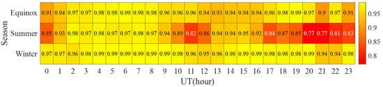 In order to measure the close relationship between hmF2 and 1/M(3000)F2, we first calculated the correlation between hmF2 and 1/M(3000)F2 according to season and universal hour (UT). The calculated results are shown in Figure 7. The correlation between equinox and winter is high, greater than or equal to 0.9, while the correlation between summer and autumn is relatively low. However, except for the correlation between UT = 20 and UT = 21, which is 0.77 and less than 0.80, the correlation between the remaining times is more significant than 0.8, which also provides the possibility for predicting hmF2 by 1/M(3000)F2.
