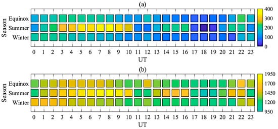 Observed data from 2014 to 2017 were trained according to season and UT, and the corresponding C0(s,t) and C1(s,t) were obtained. Figure 8a shows the inversion value of C0 at different UTs in different seasons, which is similar to C1(s,t). When UT = 8 in summer, C0(s,t) has the maximum value of 3.5524 × 102; when UT = 18 in summer, C0(s,t) has the minimum value of 3.257. Figure 8b shows the value of C1(s,t) in different seasons and at different UTs. When UT = 8 in summer, C1(s,t) has a maximum value of 1.9255 × 103; when UT = 18 in summer, C1(s,t) has a minimum value of 9.742 × 102.