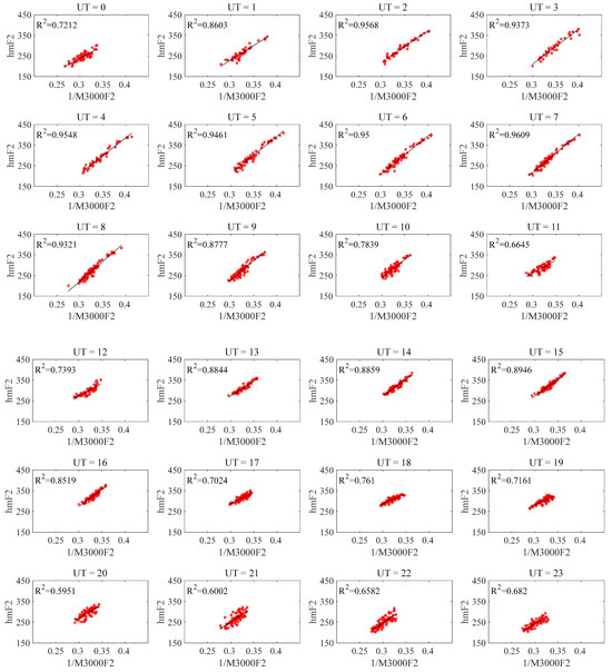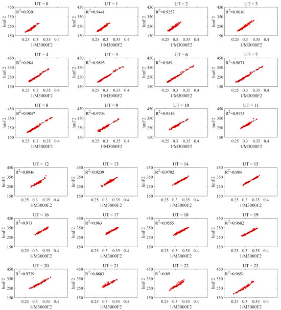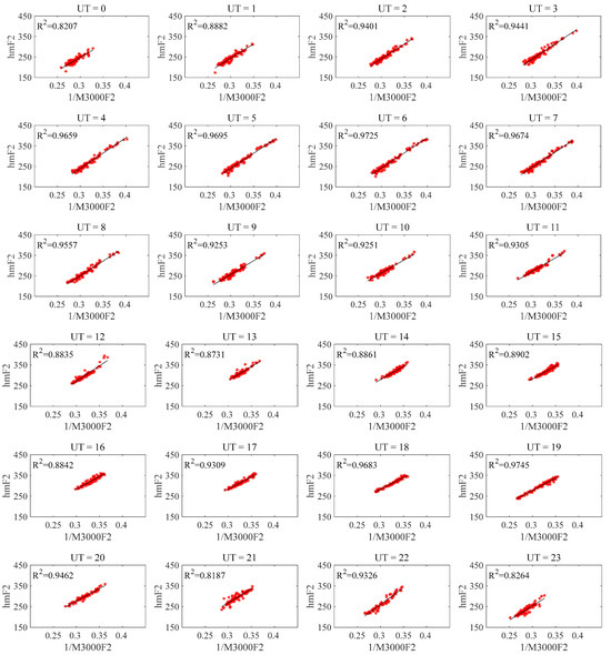 As shown in Figure 2, when ymF2 and δ are constant, hmF2 and 1/M(3000)F2 are always approximately linear, so Equation (4) can be simplified as follows: