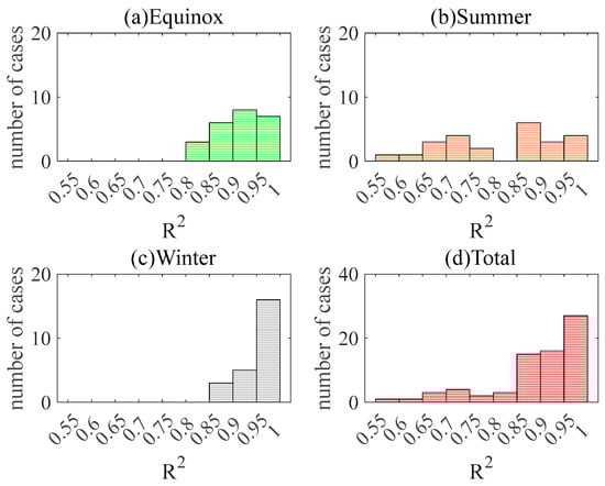 The histogram of R2: (a) Equinox; (b) Summer; (c) Winter; (d) Total.