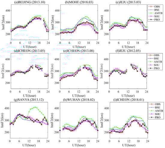 Specific data of OBS, the predicted value of three IRI models (BSE, AMTB, and SHU), and PRO: (a) Beijing (2013.10); (b) Mohe (2018.03); (c) Jeju (2013.03); (d) Icheon (2013.05); (e) Icheon (2018.08); (f) Jeju (2012.05); (g) Sanya (2013.12); (h) Wuhan (2018.02); (i) Icheon (2018.01).
