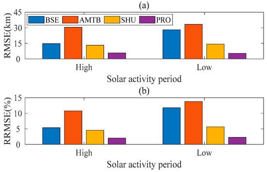 Figure 15 shows the error graph of RMSE and RRMSE calculated according to the solar activity period. The RMSE and RRMSE of the PRO model are 5.82 km and 2.04%, respectively, in high solar activity years. During low solar activity years, the RMSE is 5.39 km and the RRMSE is 2.28%. Compared with other models, the RMSE and RRMSE of PRO are much smaller than the three models of IRI, whether in high or low solar activity years.