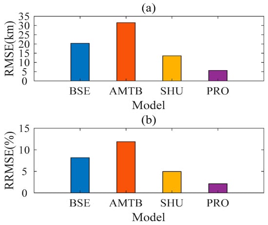 Figure 14 shows the error graphs of RMSE and RRMSE calculated according to seasons. The RMSEs of the PRO model in equinox, summer, and winter are 5.25 km, 6.61 km, and 5.12 km, respectively, and the RRMSEs of the PRO model are 2.02%, 2.26%, and 2.09%, respectively. Compared with other models, the proposed model showed absolute advantages in any season.