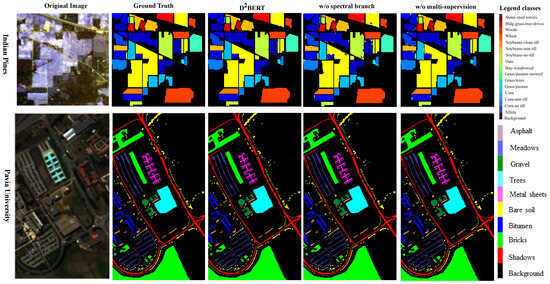 D2BERT is a high-performing model for HSIC, exploiting global and local dependencies, BERT modules, and spectral/spatial features. It efficiently explores relations among pixels and spectral bands, reducing complexity and using intermediate layer information to improve performance. Despite a longer training time than HSI-BERT, D2BERT excels in understanding data dependencies and semantic relationships, achieving a higher performance. Results about the computational burden of the compared approaches are reported in Table 5. D2BERT stands out as the most efficient model, on par with HSI-BERT, due to its relatively shallow architecture and concurrent execution of individual heads in the MHSA. Moreover, D2BERT’s parameter count is comparable to other methods, making it a competitive choice in hyperspectral image classification tasks. However, some limitations remain. First, D2BERT incurs higher memory and computational costs than traditional CNN models due to the introduction of transformers. Second, the model may not fully capture fine-grained spatial patterns at small scales due to the use of relatively large patches. Nonetheless, D2BERT also holds promising potential. Its dual-branch architecture is easily parallelizable, aiding runtime efficiency. Transformers allow modeling long-range dependencies beyond the limitations of patch-based CNN receptive fields. The main idea for future work is to investigate how lightweight transformer variants could improve efficiency while maintaining accuracy